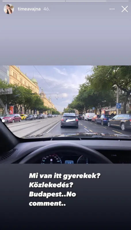 „Mi van itt, gyerekek? Közlekedés? Budapest, no komment” – írta Timi a fotóhoz, melyet az autójából készített.