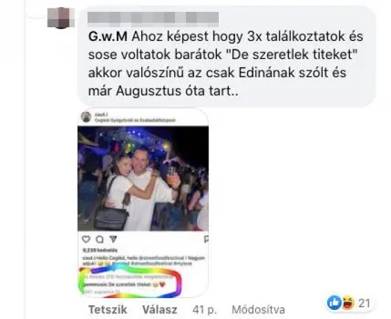 Már ez is kellőképpen megalázó lehet Edina férjének, de az talán még inkább, hogy a rajongók között joggal merül fel a kérdés: ha alig háromszor találkoztak és barátok sem voltak, akkor miért írta Csuti és Edina közös képe alá a rapper augusztusban, hogy: „De szeretlek titeket”? A vallomást szívecskével dekorálva.