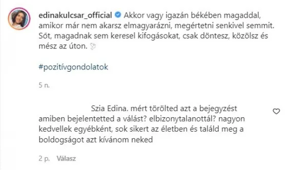 "Szia Edina. Miért törölted azt a bejegyzést, amiben bejelentetted a válást? Elbizonytalanodtál?" - érdeklődött az egyik követője.