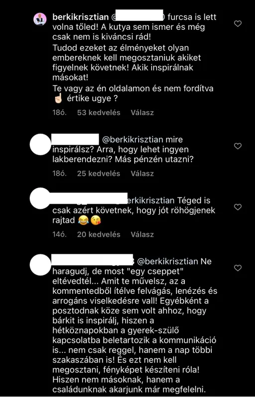 A kutya sem ismer, és még csak nem is kíváncsi rád! Tudod, ezeket az élményeket olyan embereknek kell megosztaniuk, akiket figyelnek, követnek! Akik inspirálnak másokat! Te vagy az én oldalamon, és nem fordítva! - írta a fotója alatt Berki, aki valószínűleg később rájött, hogy lehet nem kellett volna megszólalnia a témában.