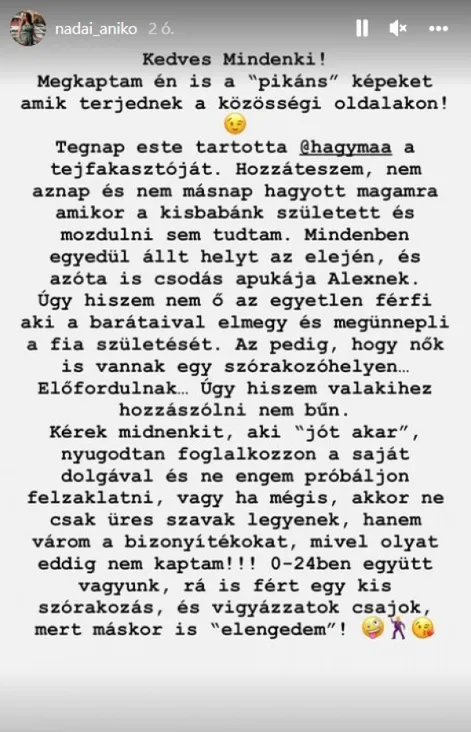 Vasárnap késő este egy eléggé félreérthető fotó szivárgott ki az internetre Nádai Anikó vőlegényéről és kisfia édesapjáról. Mivel elég homályos a felvétel, és sokan csak a sapkájáról azonosították be Hajmásy Pétert, kérdéses volt, hogy egyáltalán ő szerepel-e rajta... Ezt végül Anikó megerősítette. Szóval, Pétert egy szórakozóhelyen kapták lencsevégre egy barna hajú nővel, és a kommentelők szerint elég félreérthető helyzetben.