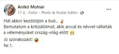 – Azok a kommentelők, akik egy híresség hivatalos oldalán arccal és névvel egyszer már vállalták a véleményüket, nem panaszkodhatnak azért, amiért kiemelik a hozzászólásukat és megmutatják még egyszer. Hiszen ha valaki a hozzászólásokat olvasva rájuk kattint, akkor is megjelenik az oldaluk, ahol láthatók. Jogilag teljesen legális, amit Anikó tesz – mondta el lapunknak dr. Gerencsér András ügyvéd.