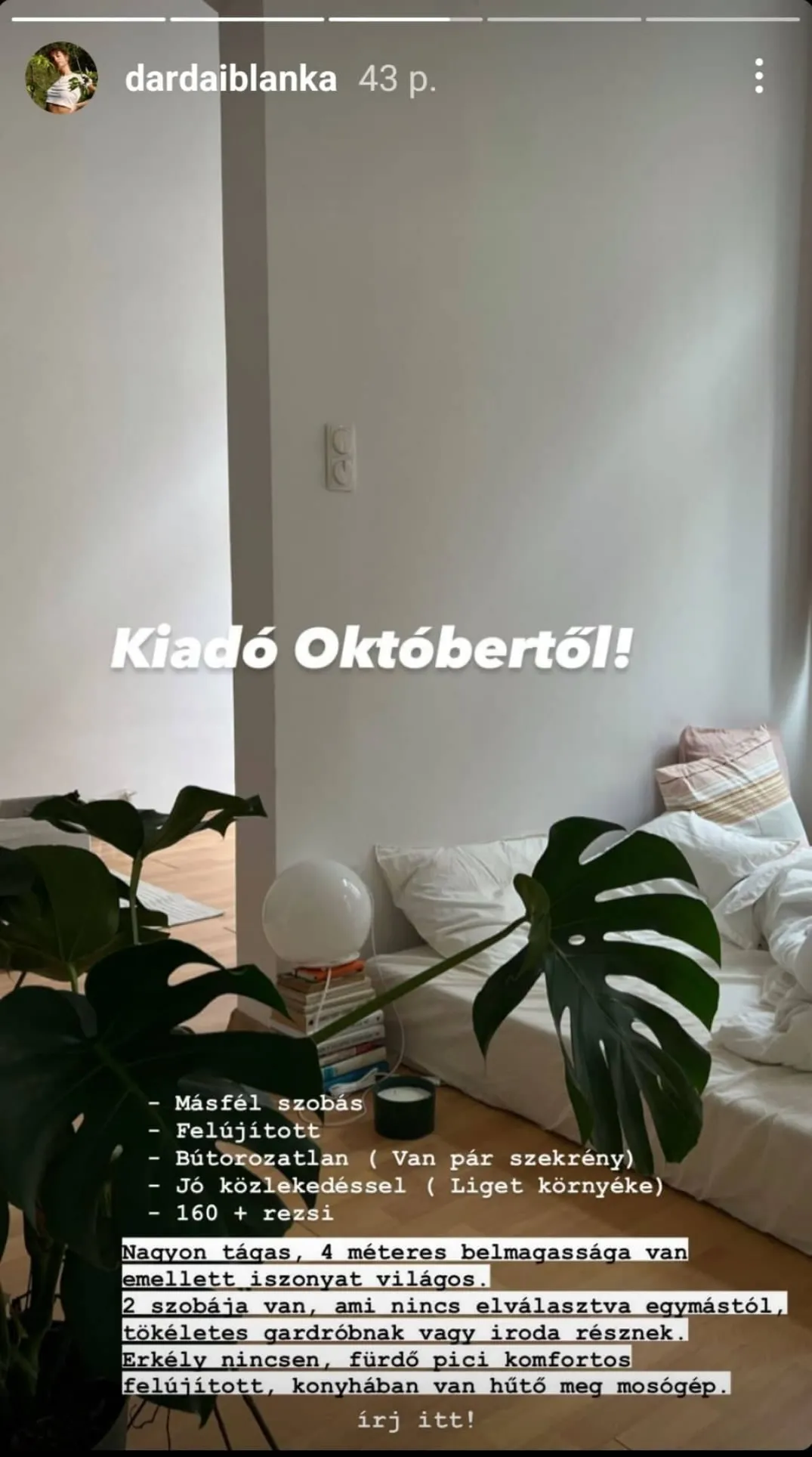 Sorsfordító lépésre szánta rá magát Dárdai Blanka, L.L. Junior új szerelme! A fiatal és roppant dekoratív énekesnő az Instagramon tette közzé, hogy október elejétől kiadó a Városliget közelségében található lakása, ami egyet jelent azzal, hogy elköltözik.