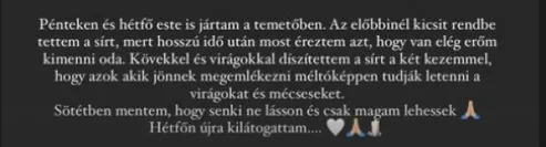Mazsi az Instagramon is közzétett egy 24 órán keresztül elérhető írást, abban azt mondja el, hogy este a sötétben járt Krisztián sírjánál, hogy ne lássa meg senki.