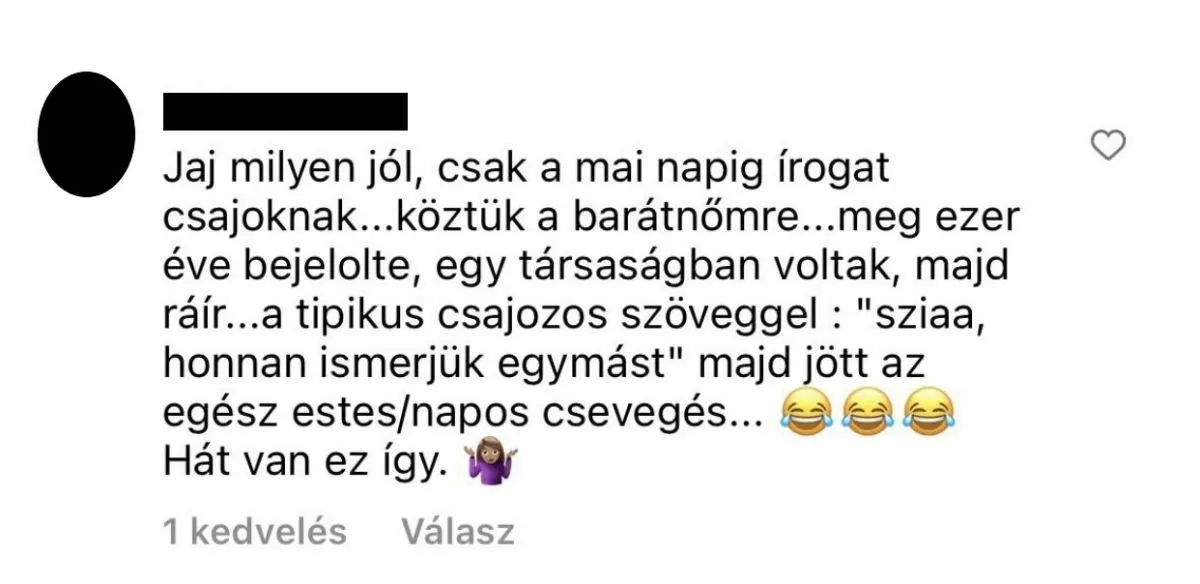 A mai napig írogat csajoknak... Köztük a barátnőmre. Még ezer éve bejelölte, egy társaságban voltak, majd ráír a tipikus, csajozós szöveggel: Szia, honnan ismerjük egymást?!, majd jött az egész estés/napos csevegés. Hát, van ez így