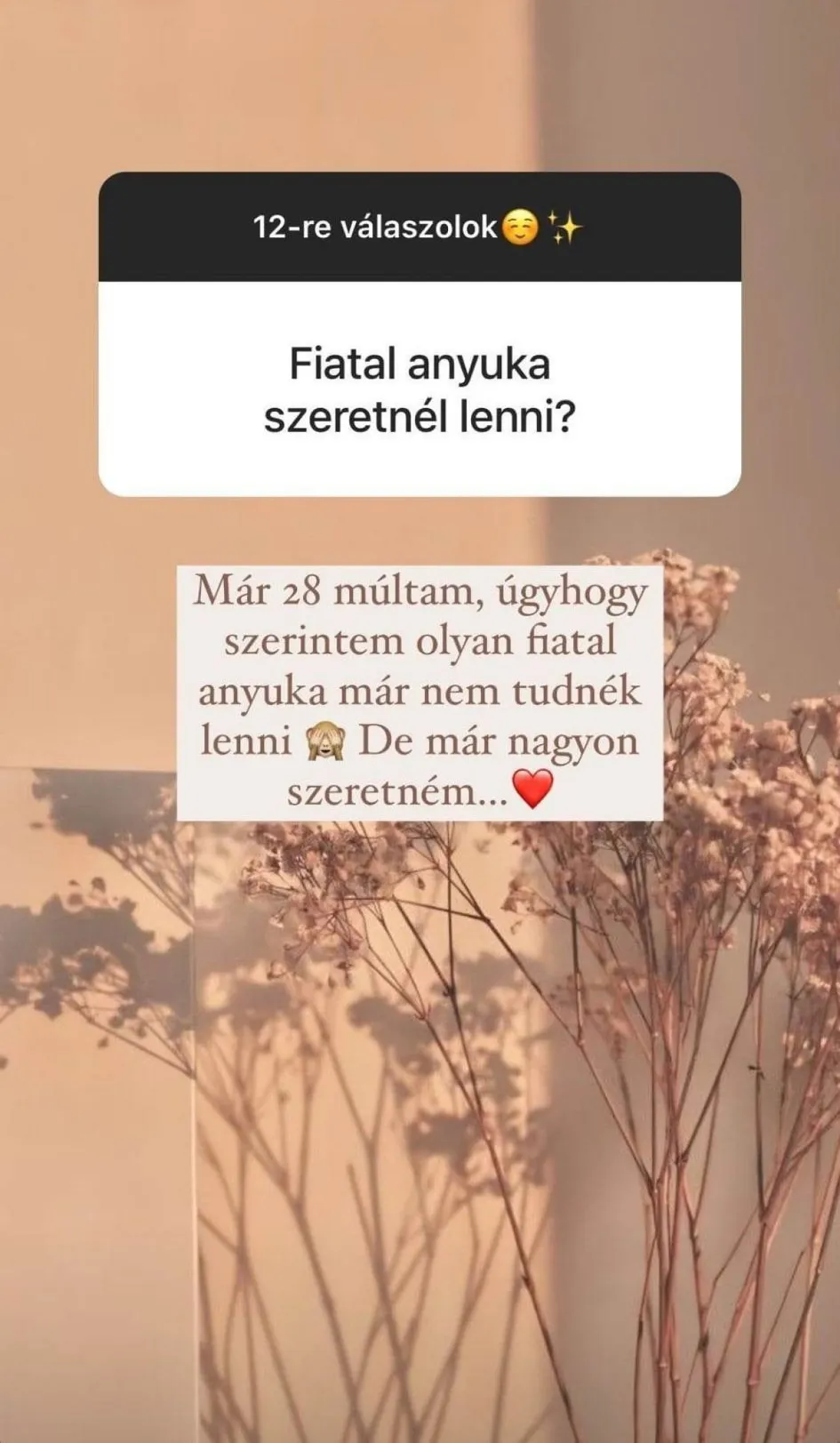 „Már 28 múltam, úgyhogy szerintem olyan fiatal anyuka már nem tudnék lenni, de már nagyon szeretném” – reagált a kérdésre az egykori szépségkirálynő. Rebeka azt is elárulta a mindössze 24 órán át elérhető Instagram-történetébe pakolt videójában, hogy gyógyszert kell szednie és odafigyel az egészségére.