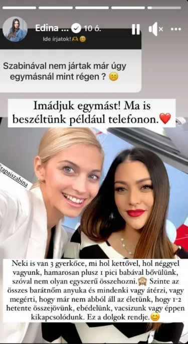 „Imádjuk egymást! Neki is van 3 gyerkőce, mi hol kettővel, hol néggyel vagyunk, hamarosan plusz 1 pici babával bővülünk, szóval nem olyan egyszerű összehozni. Szinte az összes barátnőm anyuka és mindenki vagy átérzi, vagy megérti, hogy már nem abból áll az életünk, hogy 1-2 hetente összejövünk, ebédelünk, vacsizunk vagy éppen kikapcsolódunk. Ez a dolgok rendje”− szögezte le Edina a közösségi oldalán.