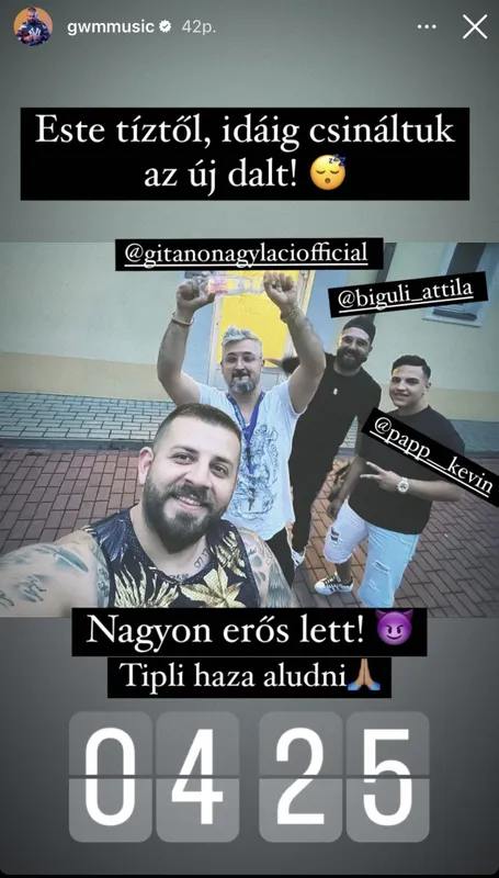- írta ki az Instagram-sztorijában G.w.M, aki a pontos időt is odabiggyesztette a poszthoz. Ennek tanúsága szerint a rapper hajnali fél ötig dolgozott a stúdióban, azaz közel 7 órán keresztül ébren maradt éjszaka. Feltehetően úgy, hogy az előző napot is talpon töltötte...