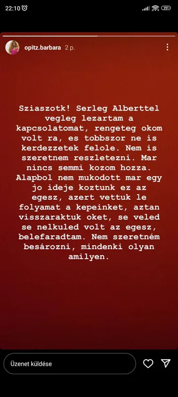 Az énekesnő legutóbb arról számolt be a közösségi oldalán, hogy szakított a kedvesével, majd pár órával később mégis egy szerelmes fotón ölelkeztek. Nem ez volt az első szakításuk, és úgy tűnik, hogy nem is az utolsó, ugyanis Opitz Barbi kedd este ismét arról tájékoztatta rajongóit, hogy szakított Alberttel.