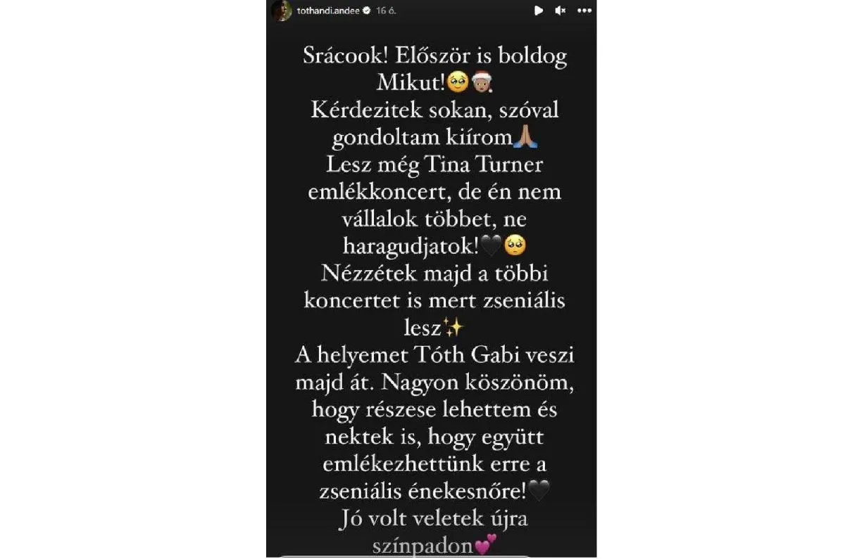 "Srácok! Először is boldog Mikut! Kérdezitek sokan, szóval gondoltam kiírom. Lesz még Tina Turner emlékkoncert, de én nem vállalok többet, ne haragudjatok! Nézzétek majd a többi koncertet is mert zseniális lesz. A helyemet Tóth Gabi veszi majd át. Nagyon köszönöm, hogy részese lehettem és nektek is, hogy együtt emlékezhettünk erre a zseniális énekesnőre! Jó volt veletek újra színpadon" - írta 24 órán át elérhető Instagram-sztorijában, ám a hírt közel sem fogadták jól rajongói. Követői ugyanis reményt láttak arra, hogy szeretett énekesnőjük újra visszatér.