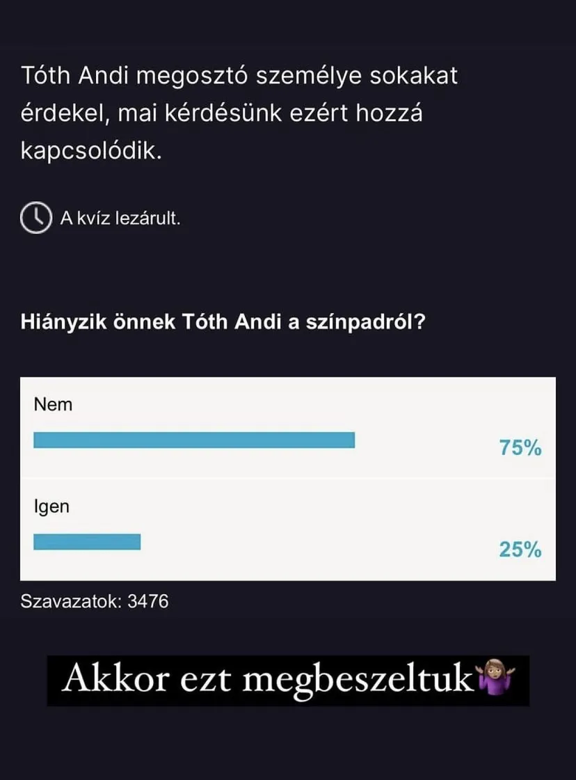 Ezért is olyan meglepő, hogy 3476 emberből a szavazók 75%-a szerint Tóth Andi nem hiányzik nekik a színpadról. Valahogyan az énekesnő is megtalálhatta ezt a szavazást, és saját Instagram sztorijában reagált is a benne látottakra: