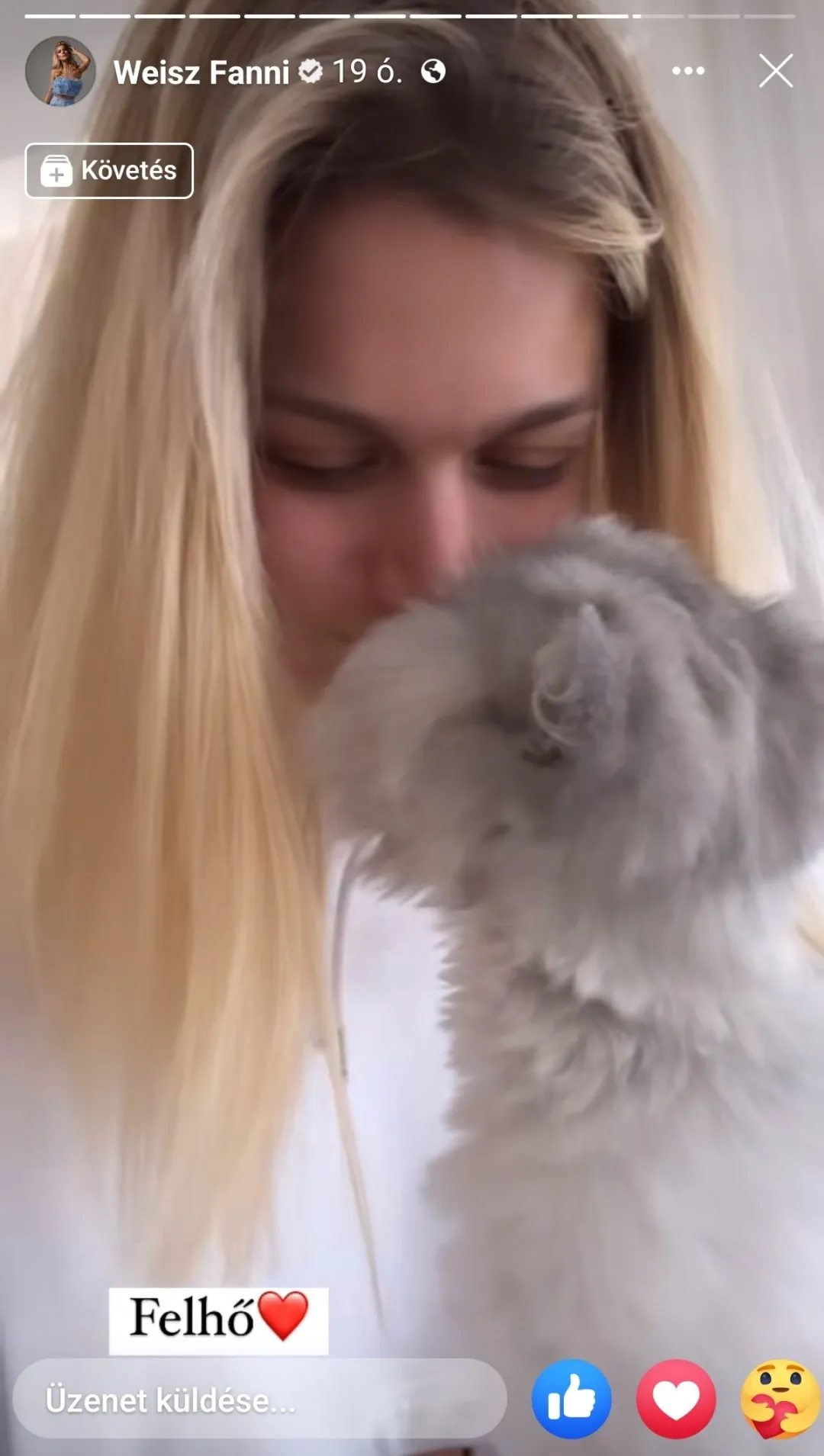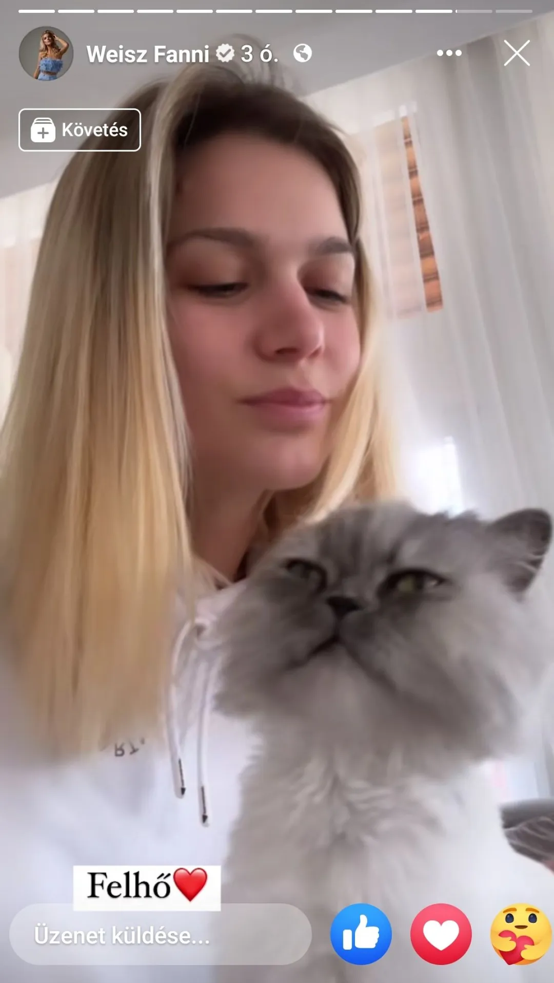 A gyönyörű modell legfrissebb Facebook-sztorijában egy hófehér cicával pózol. Fanni többször is bejelentkezett már kutyusával, illetve korábban volt már egy macskája is, de ezzel a cicussal még nem lehetett találkozni. Az nem derült ki, hogy újonnan érkezett, vagy egyáltalán az övé-e, hiszen édesanyjával, testvérével és nagyszüleivel közös otthonban laknak. Mindenesetre az állat elképsztően cuki és láthatólag óriási harmóniában van Fannival. A modell rövid videóban mutatta meg, mennyire szereti őt a kis kedvenc, össze-vissza puszilgatják egymást a macskával. A videó mellé csak annyit írt, hogy “Felhő” és egy szivecskét is tett mellé, tehát valószínűleg így hívják a cicát.