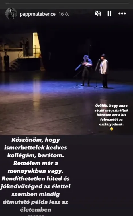 Papp Máté Bence most azonban nem boldogságból fordult a közösségi média felé, hanem bánatában. Máté ugyanis gyászol. Elvesztette egy kedves barátját, szeretett kollégáját, táncos társát. Erről 24 órán keresztül elérhető Instagram-történetében adott hírt a következő sorokkal, amelyet egy videó kíséretében töltött fel: