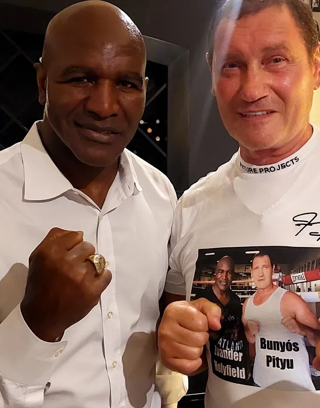 Budapesten pótolta be Bunyós Pityu és Evander Holyfield azt a találkozót, ami pár hete Miamiban elmaradt. Az amerikai bokszlegenda éppen akkor utazott New Yorkba, amikor a magyar mulatós sztár a tengerentúlon volt, de nemrég Magyarországra is ellátogatott Bacskai Balázs májusi búcsúmeccsére. Az esemény előtti napokban Kovács Kokó István szervezett egy fogadást, ahová Bunyós Pityut is meghívta. Ő pedig stílusosan egy olyan pólóban érkezett a helyszínre, amelyet egy Holyfielddel közös fotó díszített.
