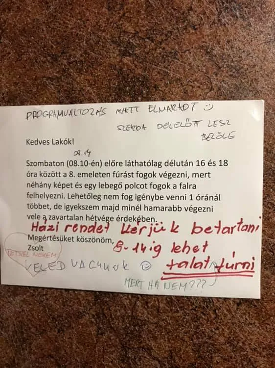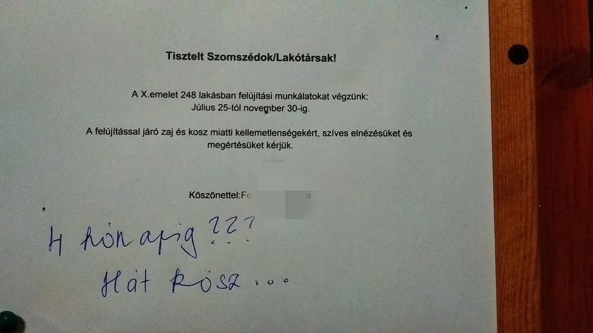 Egy magasház 10. emeletén élő lakó kiplakátolta a lépcsőházban, hogy lakásfelújítást tervez a nyár közepétől egészen ősz végéig. A 4 hónaposra tervezett munkálatok miatt kiakadtak a szomszédok.