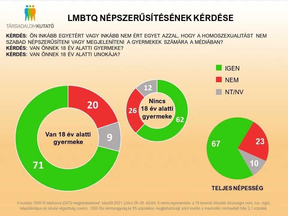 A 18 év alatti gyermeket nevelő szülők és nagyszülők 71 százaléka ért egyet a kormány gyermekvédelmi törvényének azon passzusával, amely az LMBTQ népszerűsítését tiltaná a gyerekeknek, a gyermeknélkülieknek csak 62 százaléka.