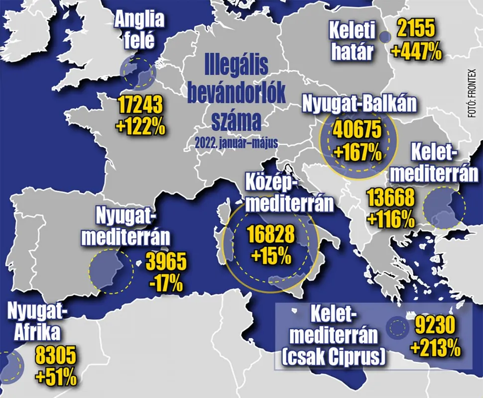 Az EU határ- és partvédelmi ügynöksége (Frontex) szerint január és május között mintegy 86 420 illegális határátlépést jelentettek az Európai Unió külső határain, ami 82 százalékkal több, mint a tavalyi év első öt hónapjában. Az EU-ba vezető legaktívabb migrációs útvonalak között a nyugat-balkáni volt a legkiemelkedőbb, ahol 167 százalékos növekedés mellett 40 675 illegális határátlépést jegyeztek fel. Ez az EU határain regisztrált összes eset felét teszi ki. Májusban mintegy 12 ezren próbáltak ezen az útvonalon az EU területére jutni, számuk a múlt év azonos hónapjához képest megkétszereződött.