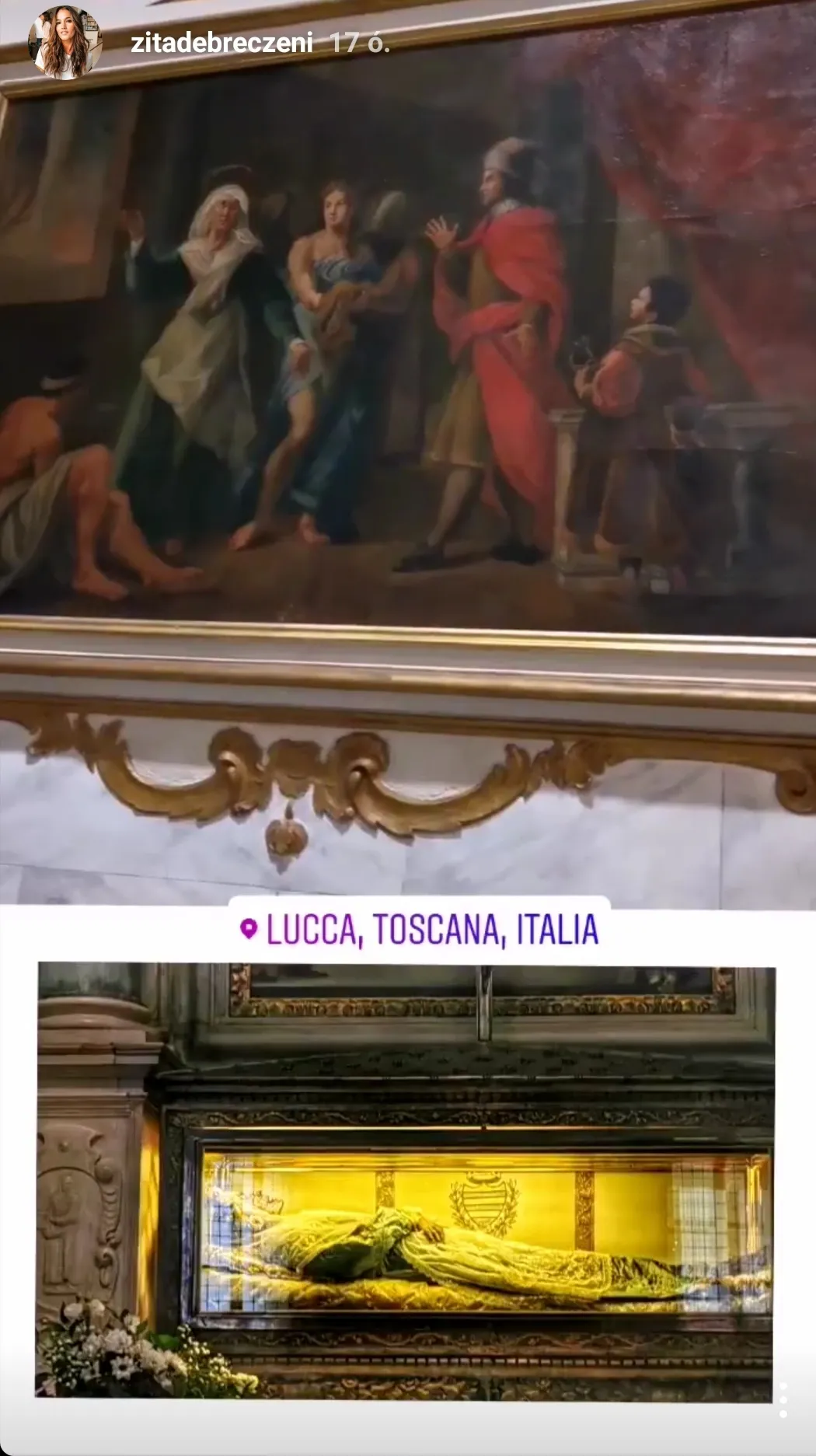 Debreczeni Zita és férje, Gianni évente többször megfordul Olaszországban, ám mostani látogatásuknak igazán különleges apropója van. A modell ugyanis már évek óta szeretett volna eljutni Lucca városába, hogy megcsodálhassa Szent Zita templomát, ahol a védőszent múmiája is található. A kiruccanásról rengeteg fotót készített Gianni felesége, sőt rajongói legnagyobb örömére megörökítette a Szent Zita múmiáját is.
