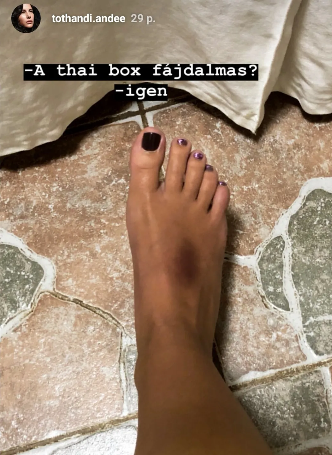 Ám ennek is megvan az árnyoldala. Andi hiába imádja ezt a sportot, ő sem ússza meg sérülés nélkül. A legutóbbi edzést a lába bánta, egy hatalmas lila folt díszeleg a lábfején. Az énekesnő az Instagram-oldalán beismerte, bizony nincs könnyű dolga, mert könnyen, fájdalmas sérüléseket lehet szerezni boksz közben.