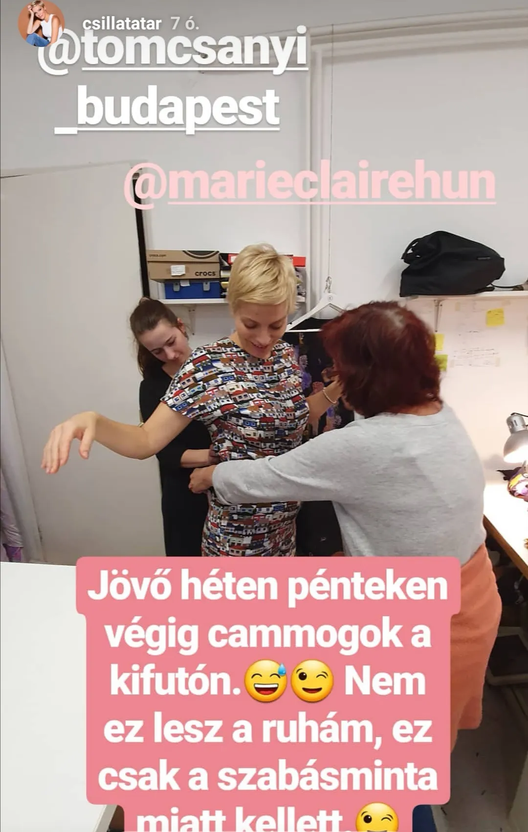 „Jövő pénteken végig cammogok a kifutón. Nem ez lesz a ruhám, ez csak a szabásminta miatt kellett” – írta az Instagram-oldalán megosztott fotóhoz Csilla.
