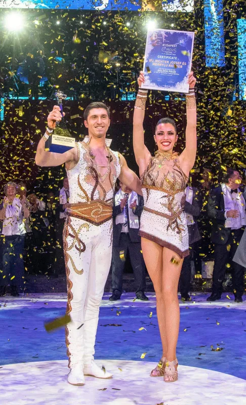 Cirkusztörténelmet írt hétfőn este a XIII. Budapesti Nemzetközi Cirkuszfesztiválon ifjabb Richter József és Merrylu Richter! A 2018-as Monte-Carlói Nemzetközi Fesztivál Arany Bohóc-díjas artistapárosa tarolt a 2020-as budapesti nemzetközi seregszemlén: produkciójukkal elnyerték mindkét fődíjat, a magyar cirkuszigazgatók aranyfokozatú díját, és a fesztivál nagydíját, az Arany Pierrot-díjat is!