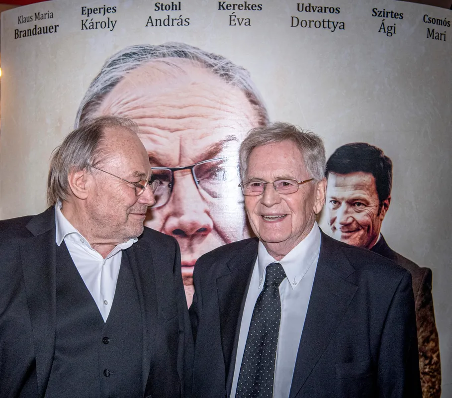 Klaus Maria Brandauer osztrák színész, a film fõszereplõje (b) és a film rendezõje, Szabó István a Zárójelentés címû film díszbemutatóján a Corvin moziban 2020. febrár 25-én.