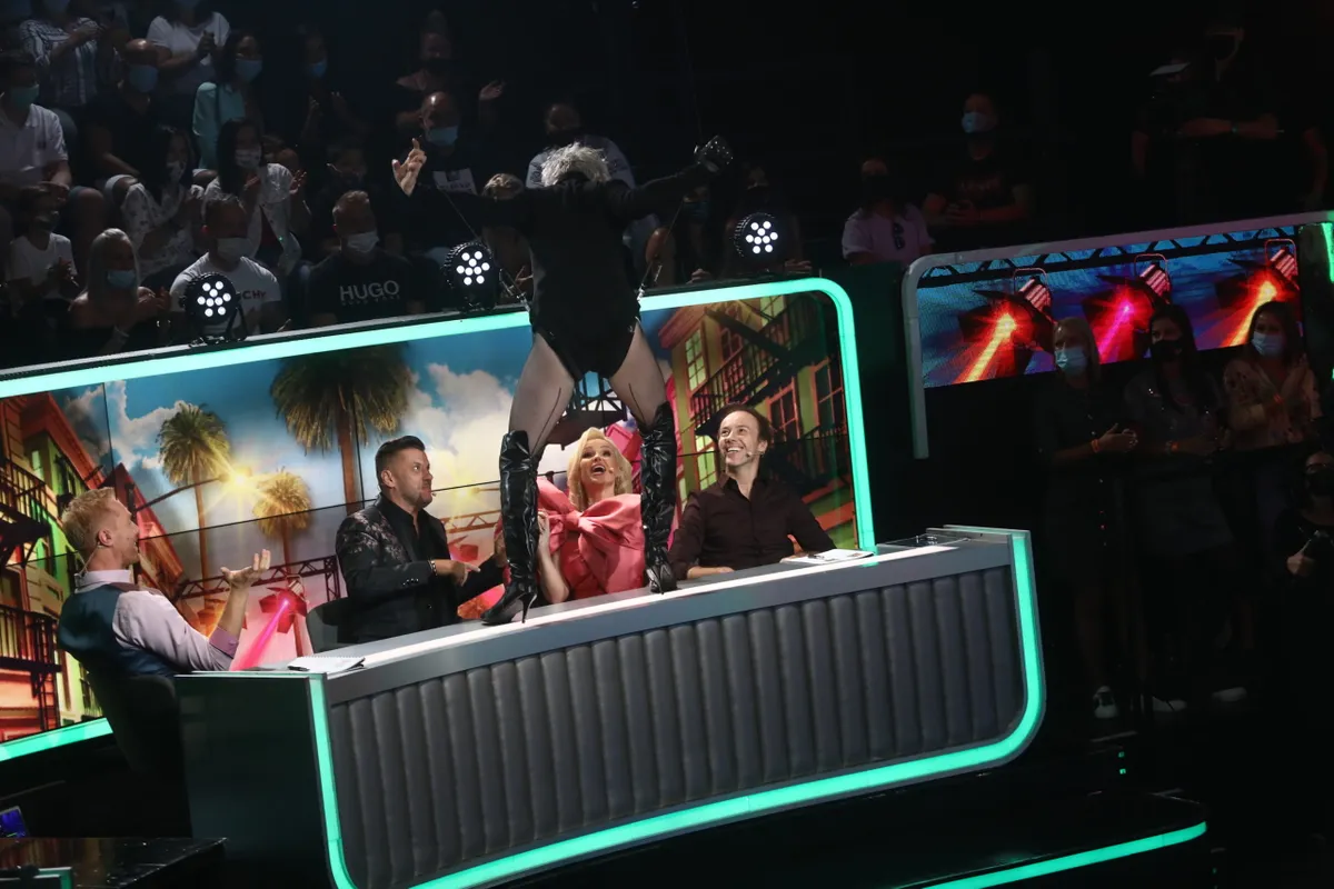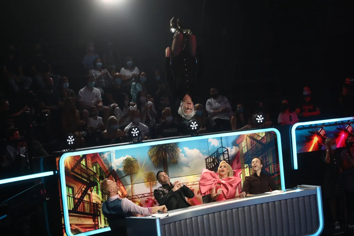 A fiatal versenyző a Rockstar című slágert adta elő, dögös női szerkóban, a produkció közben pedig a levegőbe emelkedett és a zsűriasztalon kötött ki.