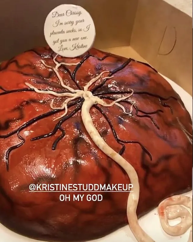 A nemrég mellkisebbítő műtéten átesett topmodell hetek óta otthon fekszik, mert veszélyeztetett terhes, így nem rendezhet a barátnőivel babaváróbulit sem. A sminkese, Kristine Studden azonban mindenáron át akarta adni Chrissynek azt a tortát, amit a harmadik csemetéje köszöntésére kitalált. Ezért házhoz küldte a placentának kinéző édességet.