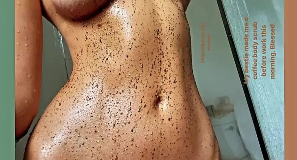 A legújabb instás bejegyzésében viszont nemcsak melltartó nem volt rajta, hanem más sem. Kizárólag néhány vízcsepp és jó sok kávézacc borította a testét. Kipróbált ugyanis egy új bőrradírt, ami a koffeintartalma miatt igencsak jótékony kávézaccból készült. A posztjával pedig a rajongói figyelmét akarta felhívni a szépségápolási trükkre.
