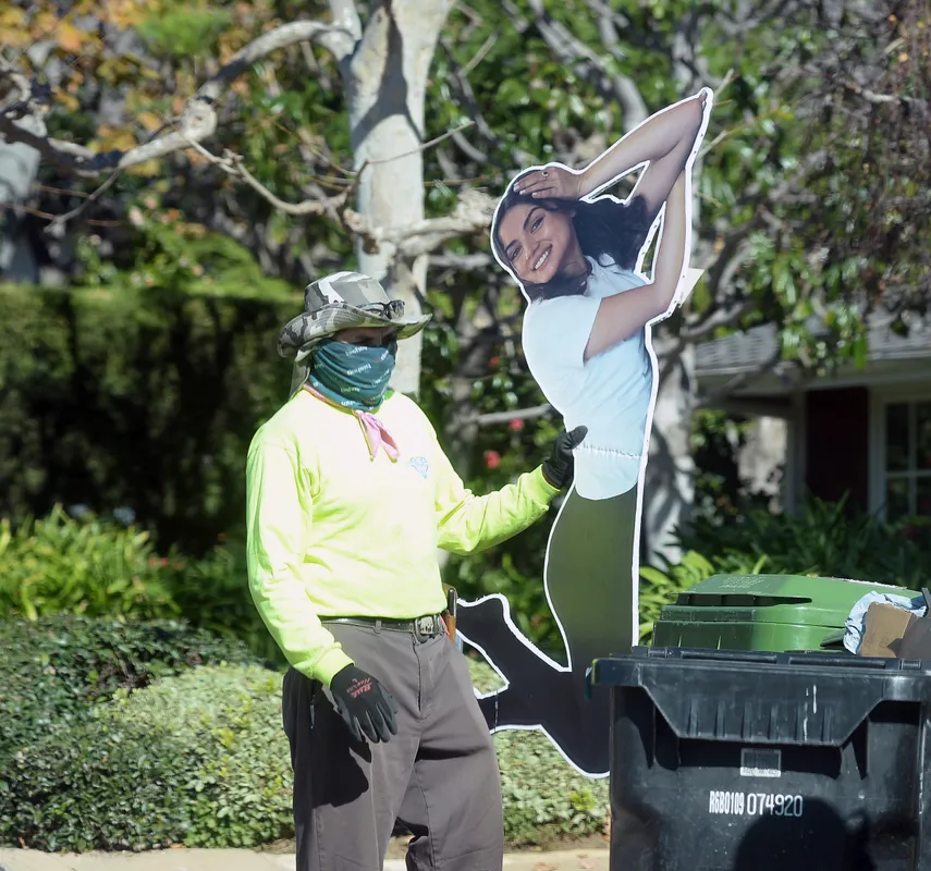 A mosolygós kartonfigurát olykor-olykor kitették a kertbe, most viszont már csak a kukásautó érkezésére vár.