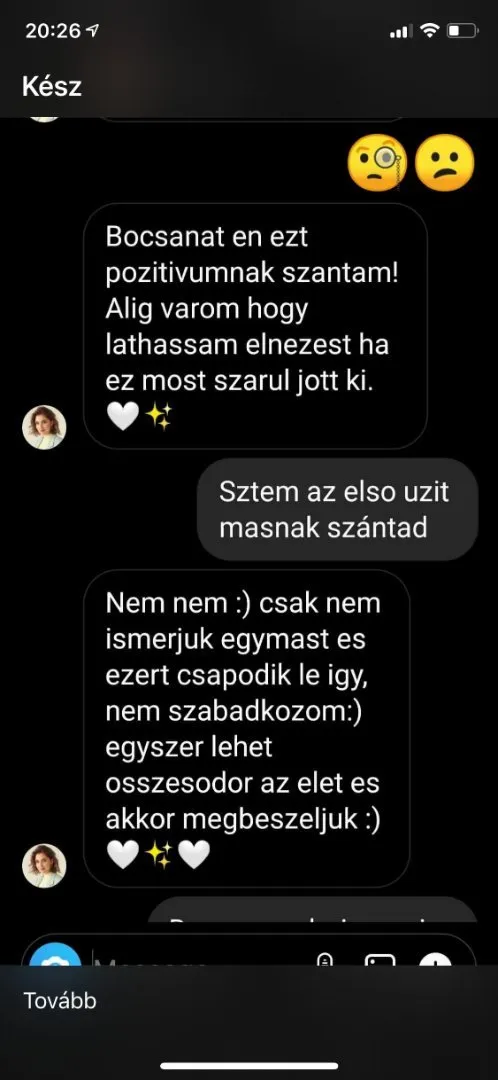 „Imádlak, egyszerűen annyira szexi vagy, besz**ás!” – próbálta menteni a helyzetet, Reni azonban átlátott a szitán. Lábas Viki azonban tovább próbálkozott, ezzel még bajosabbá tette a beszélgetést. „Bocsánat, én ezt pozitívumnak szántam! Alig várom, hogy láthassam, elnézést, ha ez most sz**ul jött ki!”
