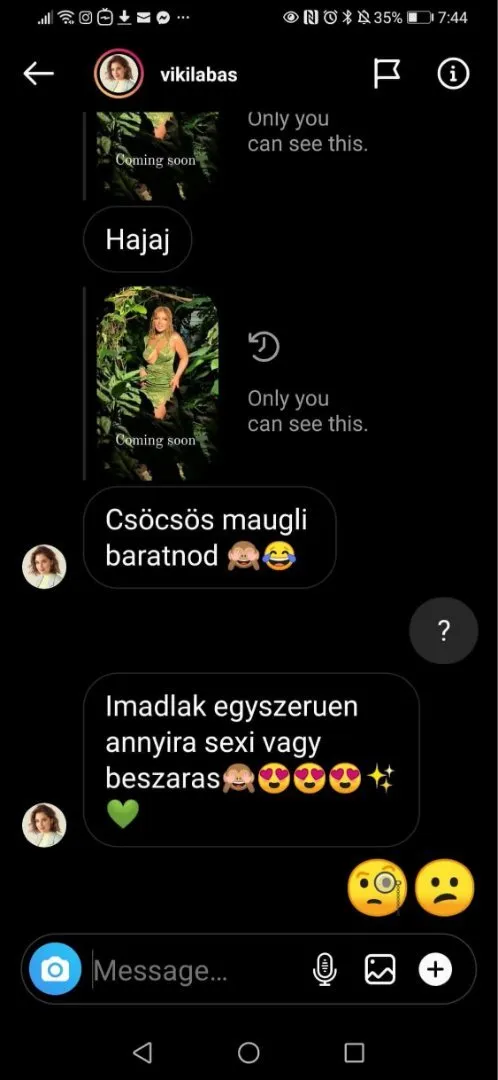 „Csöcsös maugli” – továbbította Reninek a róla írt üzenetet mire az énekesnő csak egy kérdőjellel válaszolt – szúrta ki a Bors.