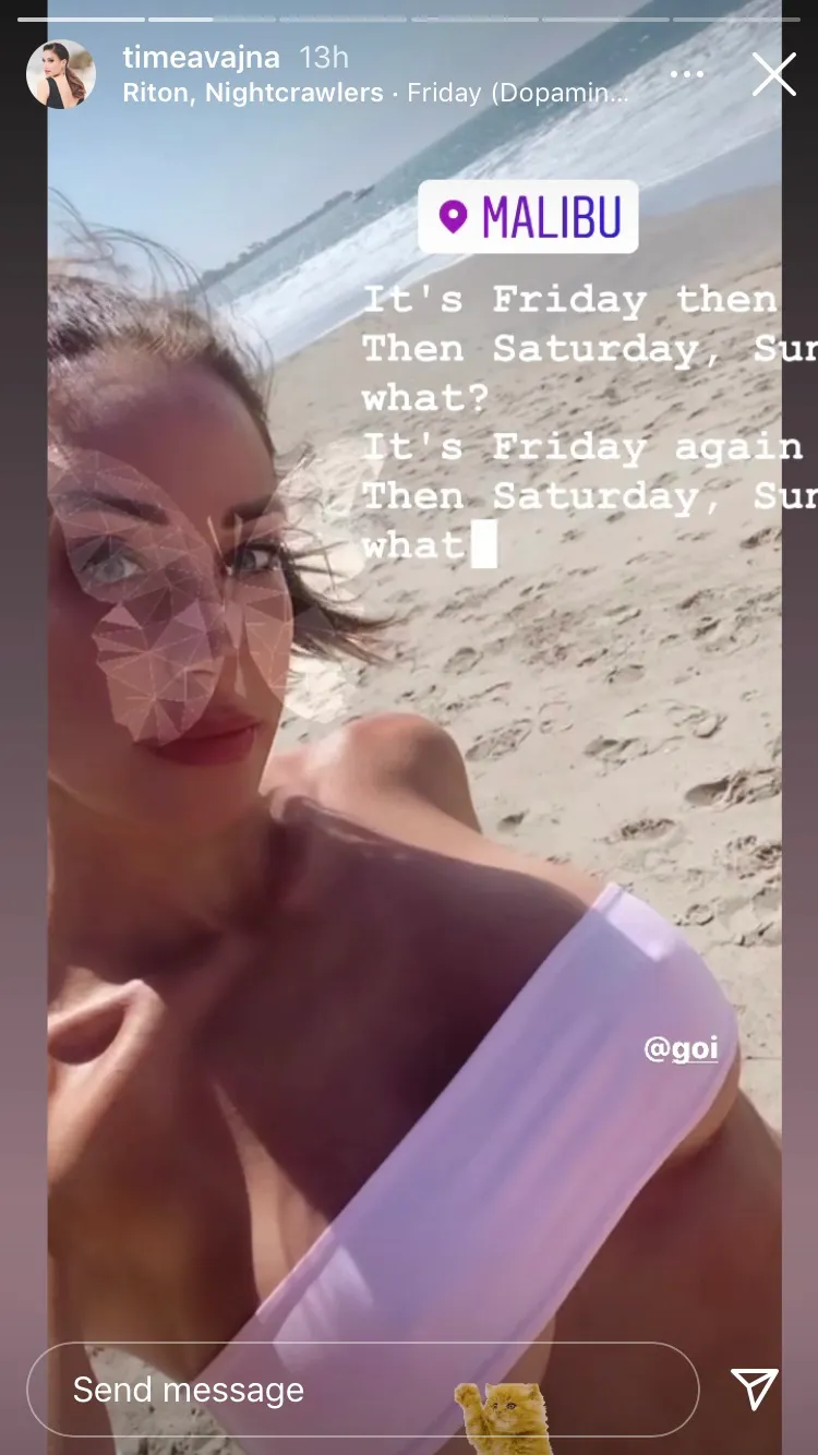 Pucér melleit csak félig eltakaró bikinifelsőben szelfizett Vajna Timi, akinek majdnem korhatárosra sikerült a fotója.