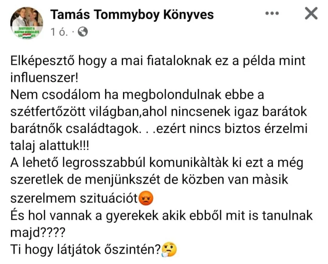 „Elképesztő, hogy a mai fiataloknak ez a példa, mint influenszer! Nem csodálom, ha megbolondulnak ebben a szétfertőzött világban, ahol nincsenek igaz barátok, barátnők, családtagok, ezért nincs biztos érzelmi talaj alattuk! A lehető legrosszabbul kommunikálták ezt a 'még szeretlek, de menjünk szét, de közben van másik szerelmem' szituációt. És hol vannak a gyerekek, akik ebből mit is tanulnak majd? Ti hogy látjátok, őszintén?” – háborgott Tommyboy, igaz, azóta törölte a bejegyzést.