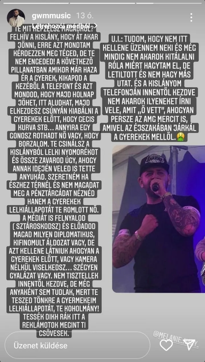 A rapper és Nagy Melanie nem igazán tudnak megjegyezni a gyermeknevelés kérdésében, ezért G.w.M úgy döntött, hogy új szintre emeli a veszekedést, vagyis a közösségi oldalon támad egykori kedvesére. Mint ismeretes, egy veretes, több ponton is meglepő posztban osztotta ki a nemzetközi kapcsolatok szakértőjeként végzett asszonyt. Ehhez olyan szófordulatokat használt, melyek egy privát vitában sem éppen szalonképesek, nemhogy a nyilvánosság előtt, leírva.