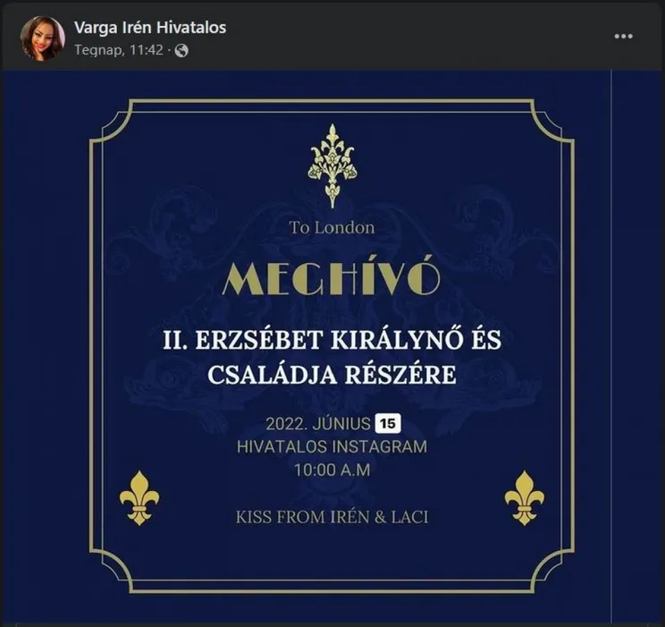 Miután a fél, vagy talán az egész világ ünnepelte II. Erzsébet trónra kerülésének 70. évfordulóját, Varga Irén fejében megfogant a gondolat, hogy méltóképpen köszöntse minden brit uralkodóját. Azt nem tudni, hogy mit látna a királynő, ha elfogadná a meghívást, de az biztos, hogy valami olyasmit, amitől megbillenne a korona a fején.