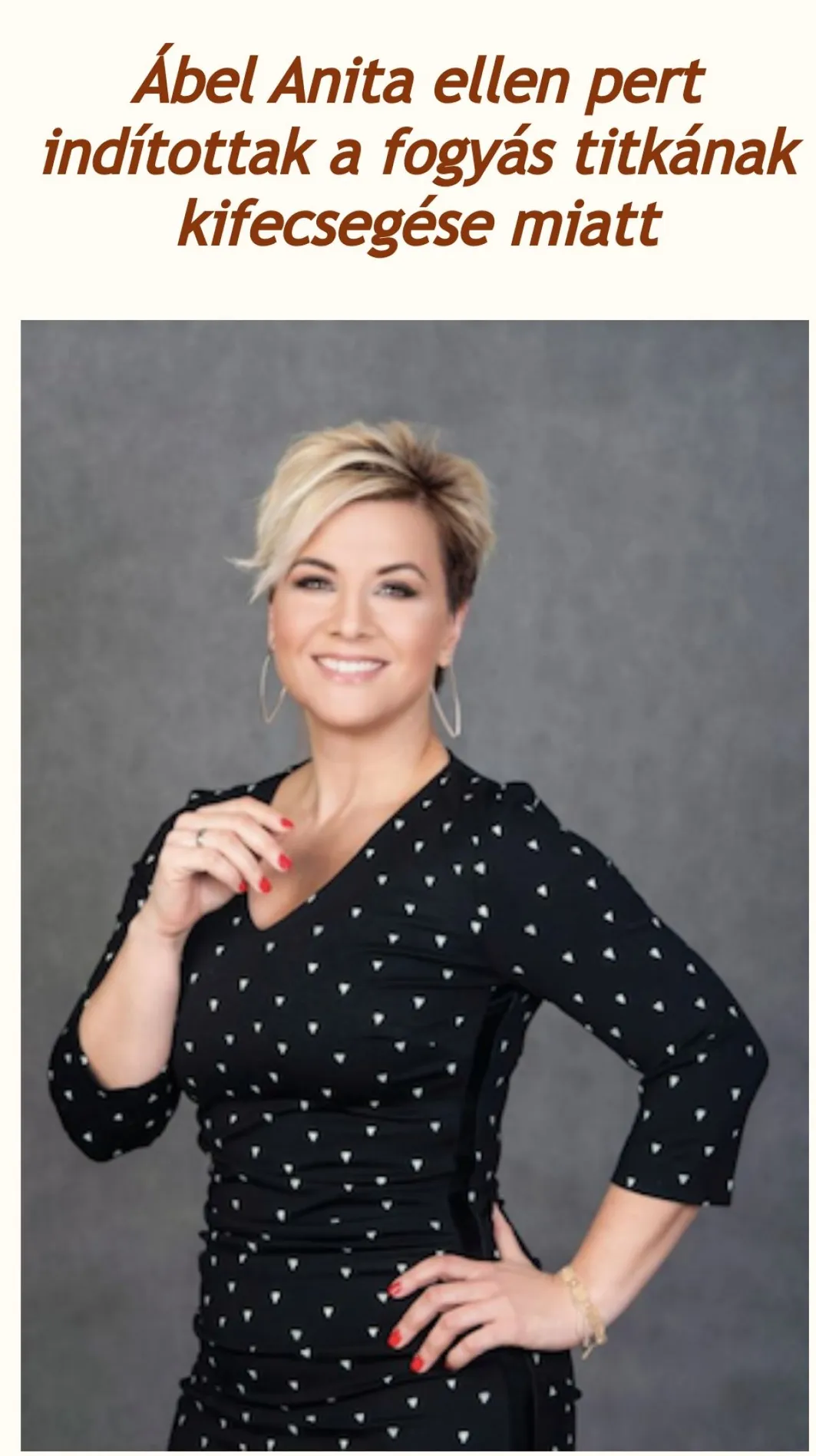 Ha valaki felül a címnek és kattint, máris talál egy álinterjút, melyben a színésznő-műsorvezető arról beszél, hogy beperelte őt a Dietetikusok Országos Szövetsége, amiért elárulta, hogy egy fogyókúrás termék segített neki leadni a fölös kilóit. Természetesen a cikkből link vezet a termék oldalára, vagyis máris kezdetét veszi a lehúzás előtti behúzás.