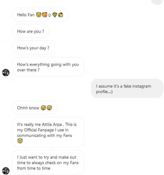 Különös, félreérthető dolog történt a Ripost egyik olvasójával! Gyanútlanul böngészte az Instagramot, amikor váratlanul elkezdte őt követni egy Attila Arpa nevű felhasználó, akinek még a profilján is a népszerű színész fotói szerepeltek, és közel kétezer követővel büszkélkedhetett. Az illető nemcsak bekövette olvasónkat, hanem angol nyelvű üzenetekkel kezdte el bombázni, amik nagyon érdeklődőek voltak. Mintha valami hátsó szándék vezérelné...
