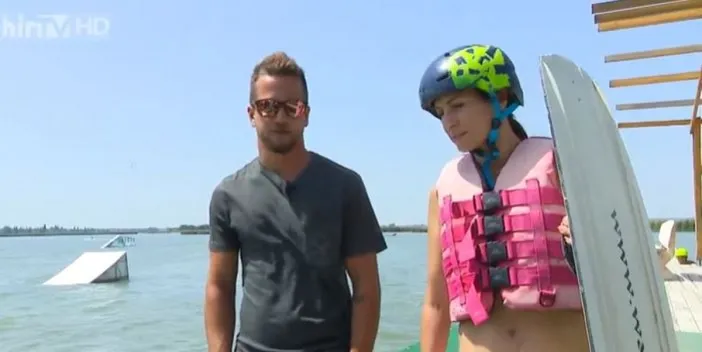 A profik közé most a Radar csinos riportere is beállt, és ha a wakeboardozást így elsőre nem is, de az eséseket élvezte.