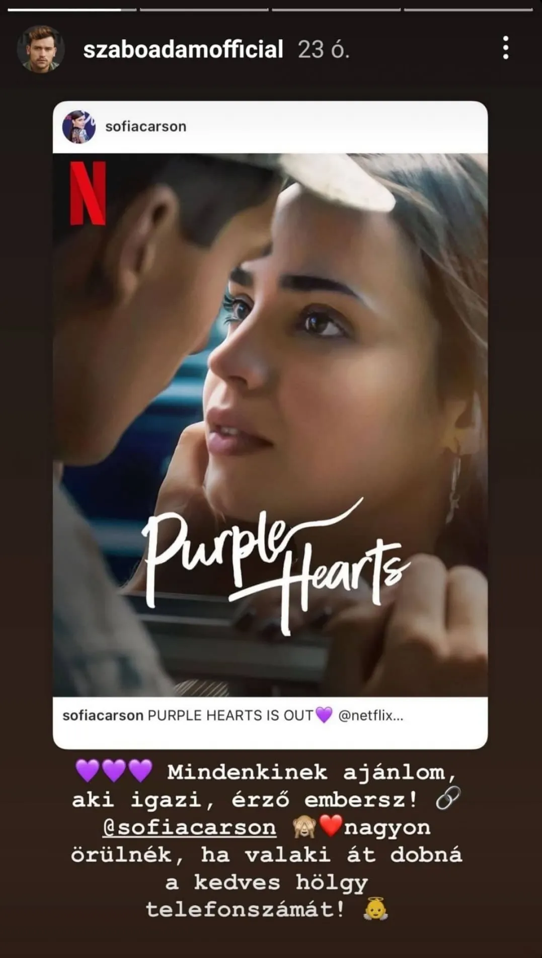 Néhány magányos órájában úgy döntött, bizalmat szavaz a Netflixen nemrég megjelent Purple Hearts, azaz Bíbor szívek című filmnek, ami lényegében arról szól, hogy egy feltörekvő zenész hogyan találja meg végül a szerelmet egy katona karjaiban. A film női főszerepét a 29 éves énekes-színésznő, Sofia Carson játssza, az alakítása pedig egyből levette Ádámot a lábáról.