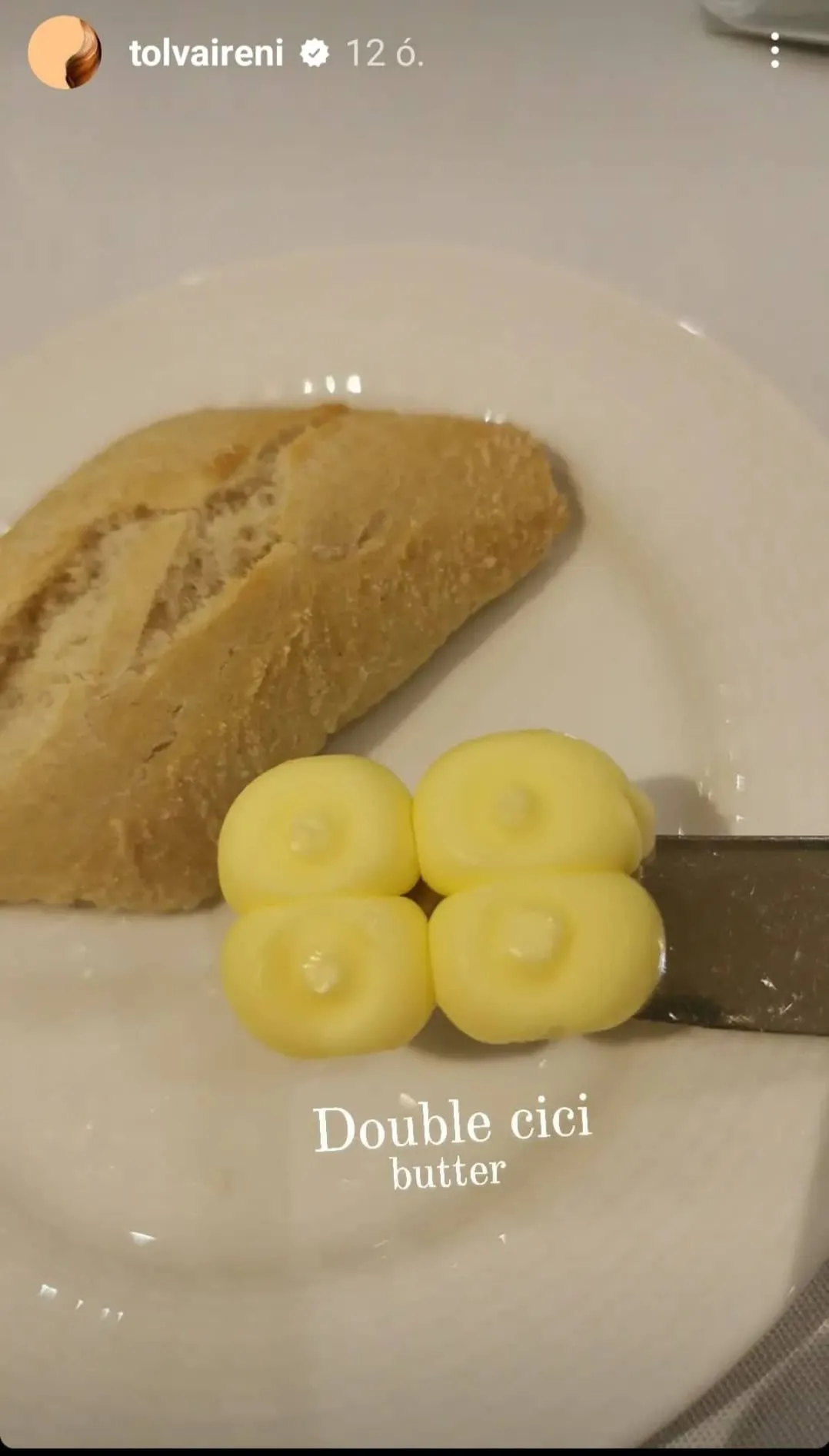 Ám itt még nem értek véget a kulináris kalandok! Reninek ugyanis egy olyan különleges alakú vajat szolgáltak fel, amiről egyből két pár mell jutott az eszébe.