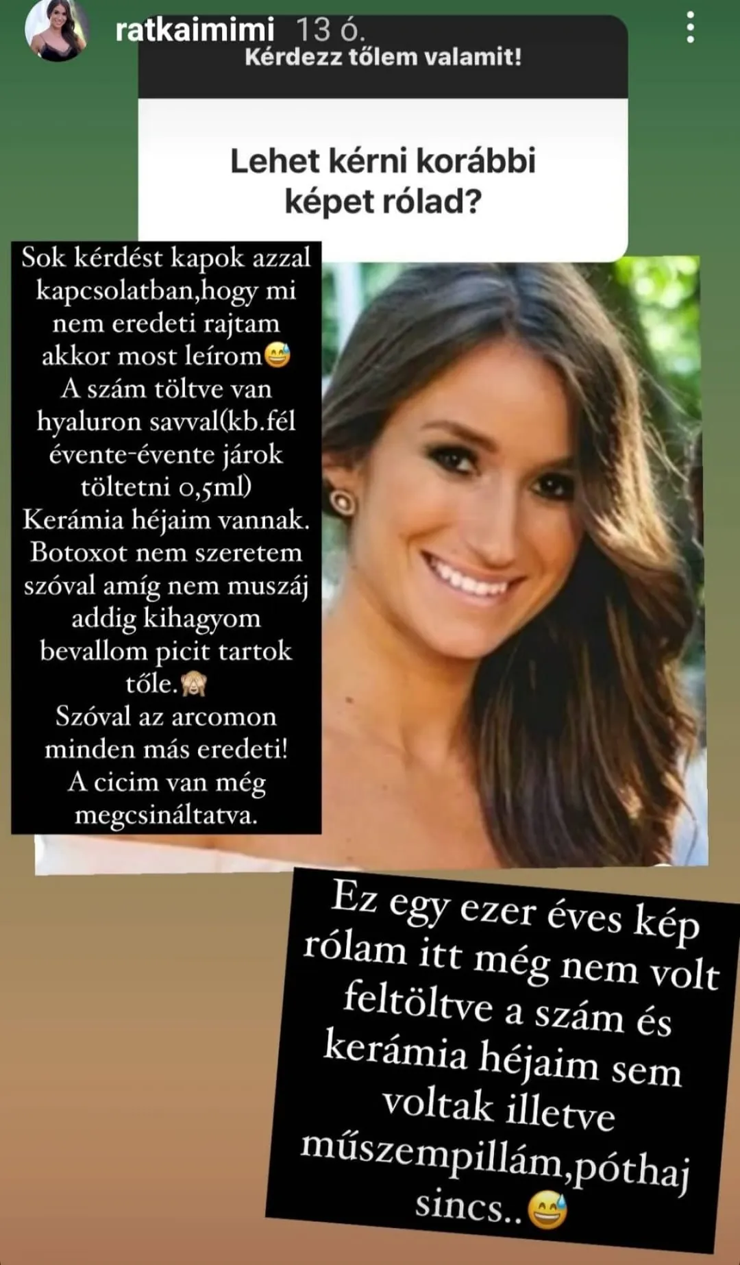 A 33 éves bombázó rengeteg kérdést kap az Instagramon, amikre igyekszik őszintén válaszolni. A legutóbb azt a kérdést szegezték neki, hogy milyen szépészeti beavatkozásokon esett át. Mimi elárulta, hogy az ajkát rendszeresen tölteti hyaluronnal, a fogsorán kerámia héj van, ezért olyan szép a mosolya, valamint a melleit is megcsináltatta. Árpa egyik kérője egy régi fotót is megosztott magáról, ahol még nem volt feltölve a szája, műszempillája és póthaja sem volt.
