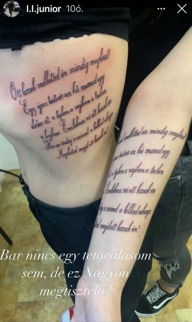 L.L. Junior egy nagyon szépen kidolgozott tetoválásról osztott meg fotót az Instagram-oldalán. Egy fiatal nő látható rajta, aki Junior Ott leszek melletted című dalának a szövegét varratta az oldalára és alkarjára, a kész művet pedig elküldte a zenésznek.