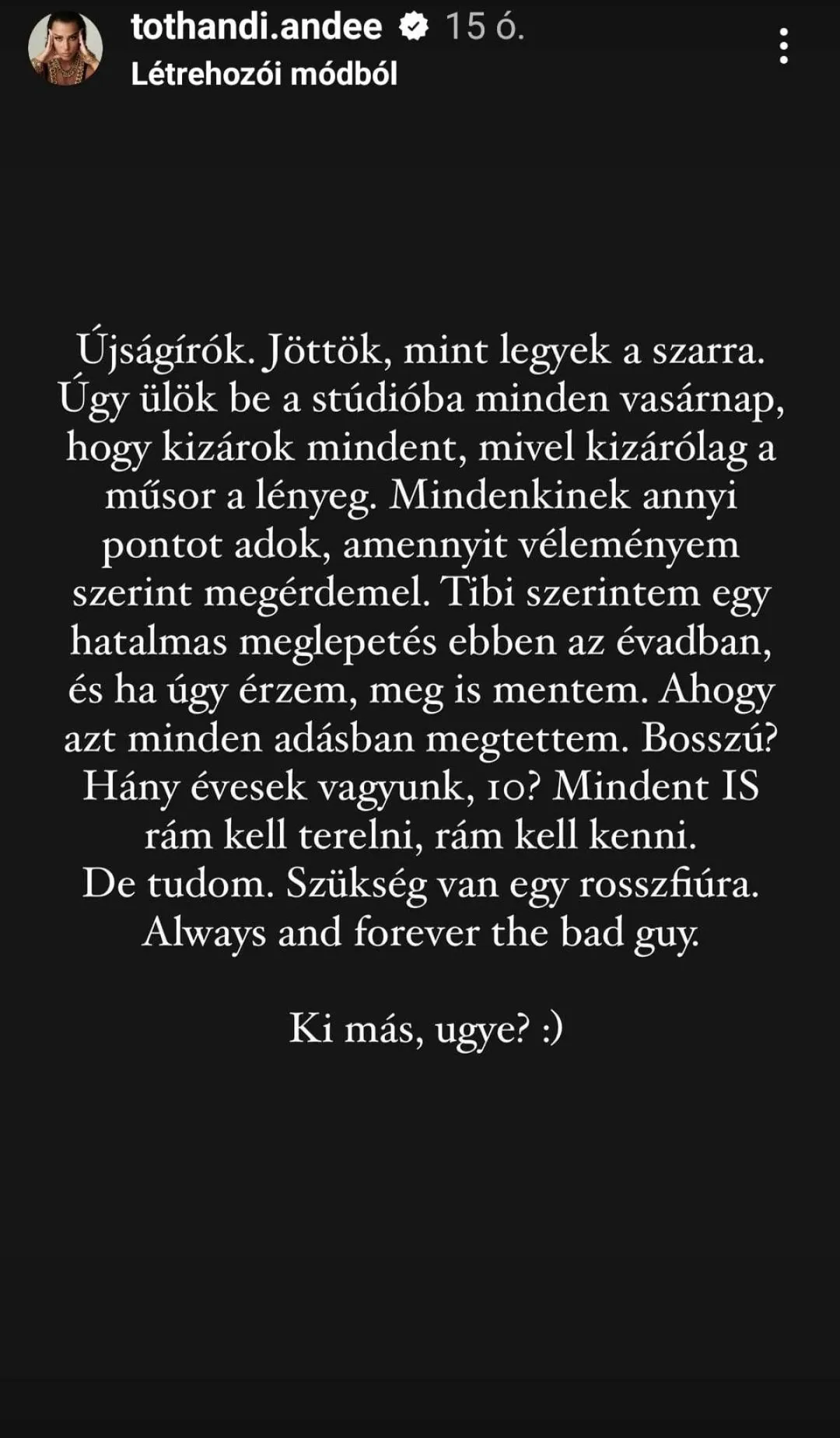 "Újságírók. Jöttök, mint legyek a sz*rra. Úgy ülök be a stúdióba minden vasárnap, hogy kizárok mindent, mivel kizárólag a műsor a lényeg. Mindenkinek annyi pontot adok, amennyit véleményem szerint megérdemel. Tibi szerintem egy hatalmas meglepetés ebben az évadban, és ha úgy érzem, meg is mentem. Ahogy azt minden adásban megtettem. Bosszú? Hány évesek vagyunk, 10? Mindent is rám kell terelni, rám kell kenni. De tudom. Szükség van egy rosszfiúra. Always and forever the bad guy. Ki más?" – háborgott Andi a közösségi oldalon, utalván ezzel arra, hogy semmi gond a párkapcsolatával, csupán el tudja választani a munkát a magánélettől.