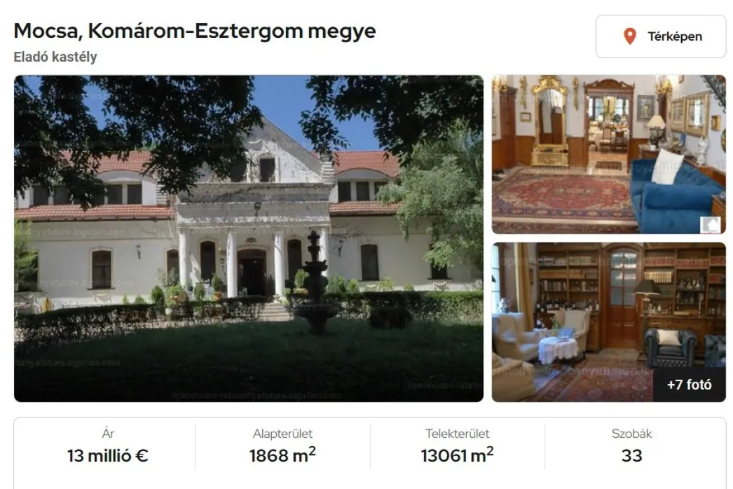 A mocsai kastély és birtok már egy jó ideje eladósorban van, az ideális vevő azonban még nem érkezett meg rá. A jelentkezőnek egyébként, legyen akármilyen vastag a pénztárcája, nagyon észnél kell lennie, hogy a megfelelő pillanatban csapjon le az ingatlanra, hiszen Lajcsi euróban adta meg a vételárat, ami jelenleg 13 millió euró, vagyis a cikkünk születésének idején 4 milliárd 954 millió forint, plusz az apró...