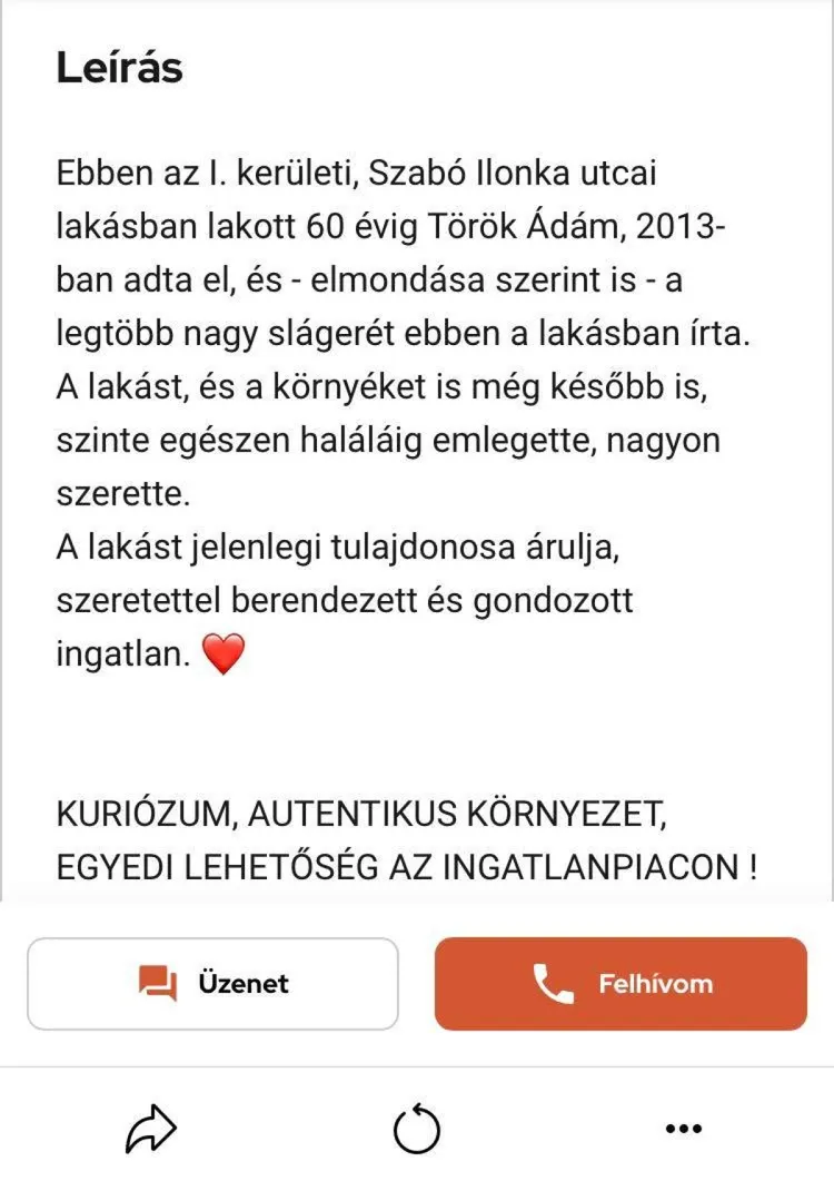 A hír igaz, a Budapesten, a Várnegyedben található lakás valóban évtizedekig Török Ádám családjának birtokában volt, tényleg ott laktak és a zenész nagyon szeretett ott lenni. A hirdetéssel nem ez a probléma. Hanem az, hogy április 18-án, Török Ádám halálhírének bejelentése után körülbelül három órával élesedett be ezzel a szöveggel...