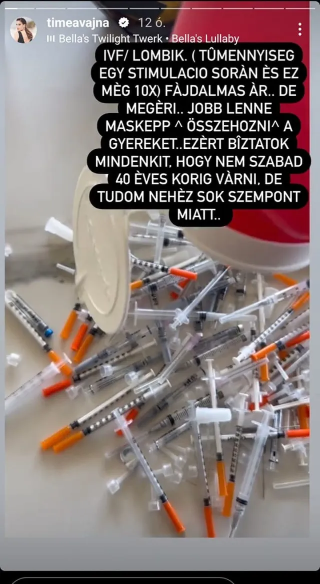 Ahogyan arról lapunk már beszámolt, Vajna Timi már az ötödik lombikprogramot is elkezdte és elképesztő, mit vállal, hogy végre a kezében tarthassa saját babáját. Azon túl, hogy az esetleges teherbeesés ígéretével kecsegtet a lehetőség, rengeteg kellemetlen, lelki és fizikális mellékhatással járhat. A leendő anyuka a megtermékenyítés folyamata alatt megannyi fecskendőtűvel, naponta többféle hormont kell hogy beadjon magának. A dolog nehézsége az is, hogy van, ami a hasba, de van olyan is, amely a popsiba kerül.