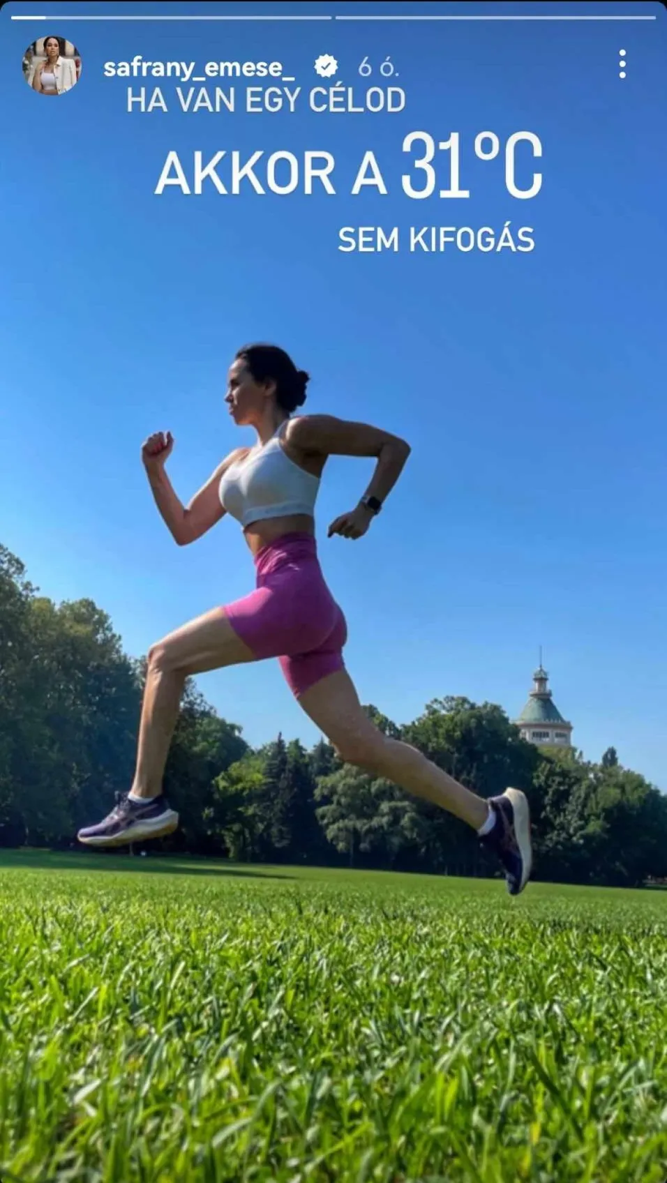 Titkos projektre készül Sáfrány Emese! A csinos légtornász motiváló képet osztott meg a közösségi oldalán: „Ha van egy célod, akkor a 31 fok sem kifogás”, fogalmazott a fotónál, amin épp futás közben kapták le őt. A csinos anyuka szerelmese a sportolásnak, ám elárulta, nem az a legfőbb célja, hogy jobb alakja legyen tőle!