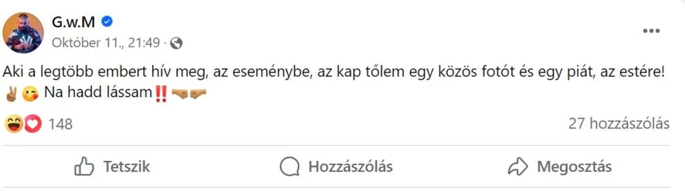 Aki a legtöbb embert hívja meg az eseményre, az kap tőlem egy közös fotót és egy piát az estére. Na, hadd lássam!