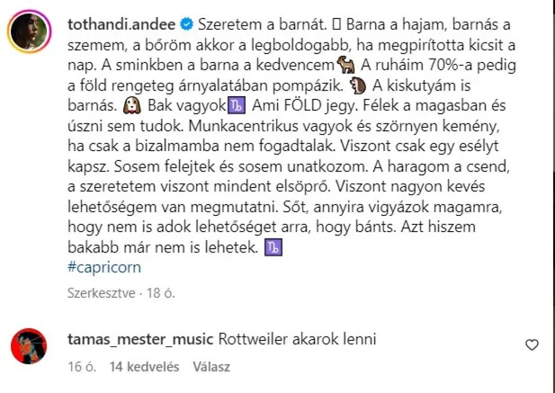 Tóth Andi szombaton egy ezoterikus, asztrológiával kapcsolatos bejegyzésben ecsetelte, hogy tőle, mint Bak jegyűtől, mégis mire lehet számítani. Sorai vitathatatlanul felkeltették Mester Tamás érdeklődését!